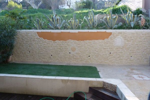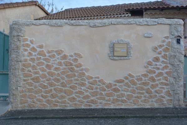 Enduit décoratif aspect pierre et enduit crépi minéral. Réalisation d'un mur cassant réaliser avec du crépi minéral, lisse et avec des contours en aspect pierre. Ce qui donne à votre clôture un mur qui se différencie des autres.
